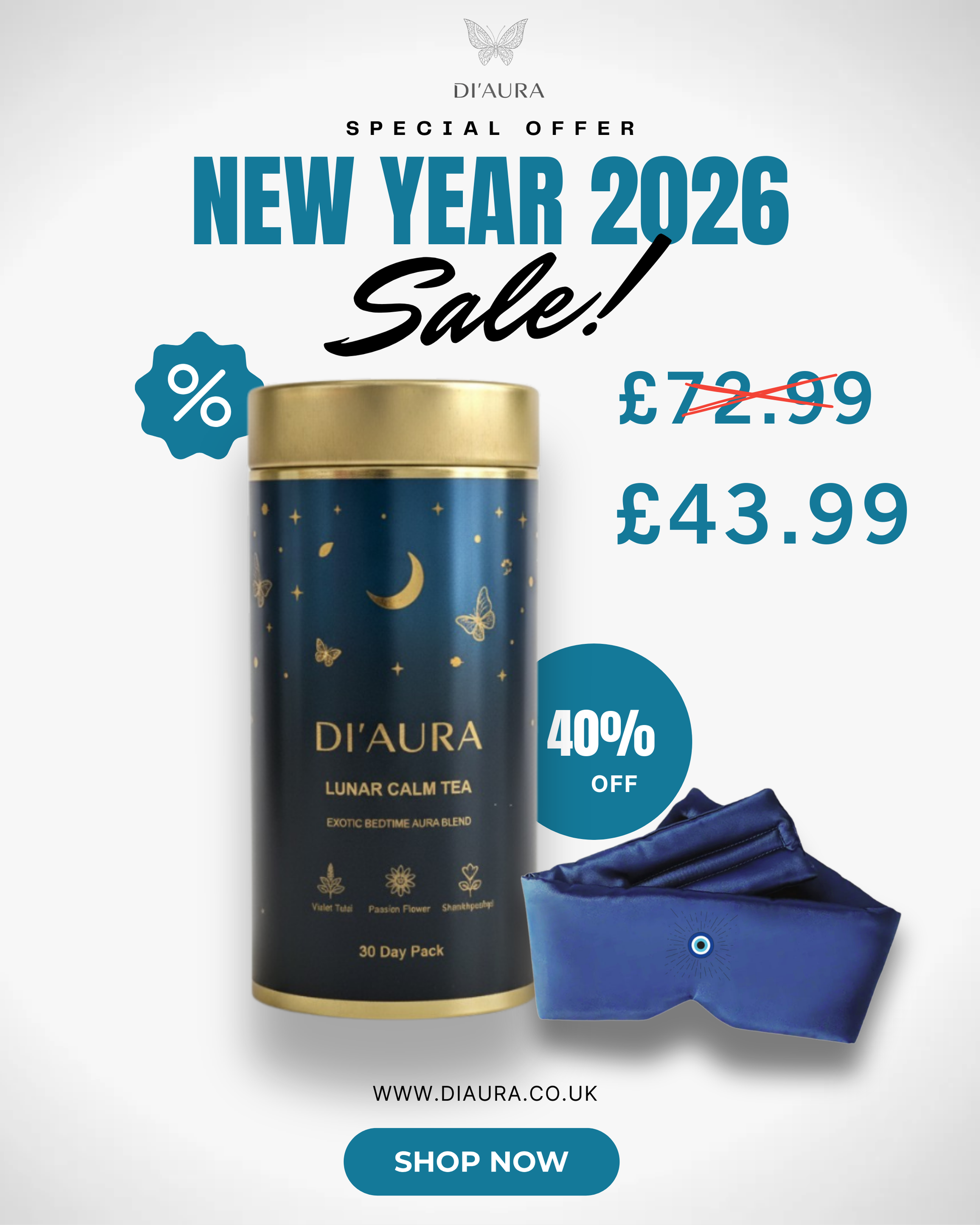 Paired with a DI’AURA luxury bamboo sleep mask, the experience is elevated through breathable, vegan softness that calms sensory fatigue and naturally reduces light exposure. The cloud-soft bamboo fibre gently cocoons the eyes, helping settle the nervous system and encouraging deeper evening comfort. Each design - whether DI'AURA black golden butterfly, evil eye Mati Blue or Cute Girl pink, adds meaningful symbolism to the ritual. Together, they form a winter night companion that promotes quiet, comfort and emotional ease.